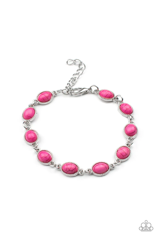 Encased in studded silver frames, oval pink stones delicately connect around the wrist for a vivacious pop of color. Features an adjustable clasp closure.